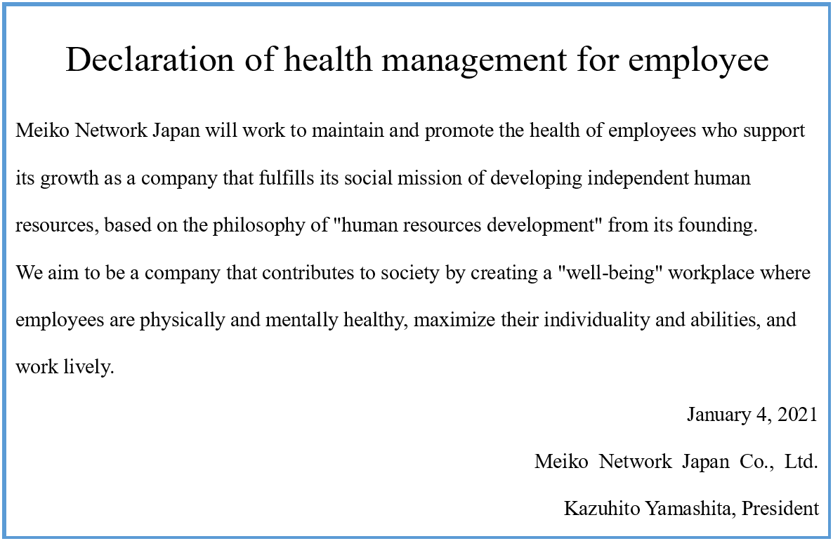 We have now declared our commitment to "health management" and will actively work to maintain and promote the health of all of our working employees.