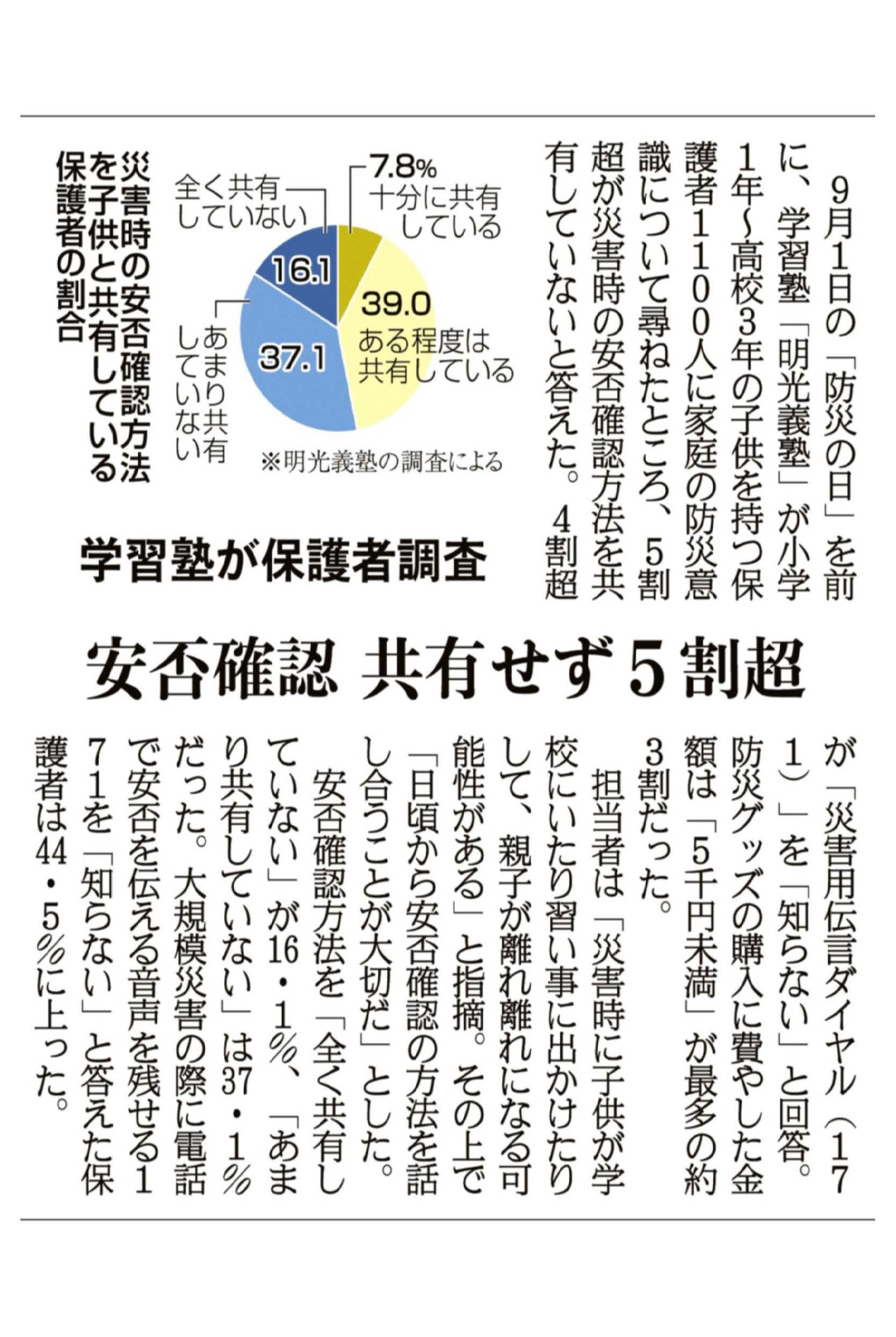 学習塾が保護者調査 安否確認 共有せず5割超 産経新聞8月29日(共同通信配信)にて当社の調査リリース 明光義塾調べ 「子どもがいる家庭の防災に関する実態調査」 (2025年8月8日)についてお取りあげいただきました。