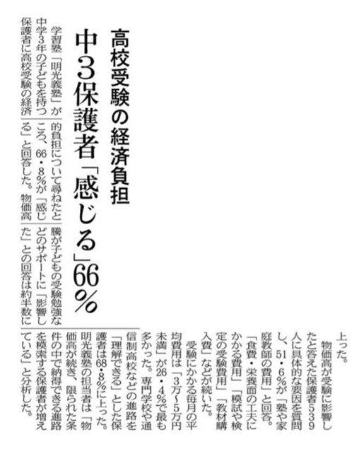 12月に実施した「受験生を支える保護者のサポート実態調査」が、1月13日付の日本経済新聞朝刊(22面)に掲載されました。受験生をかかえる保護者1,000名の高校受験の経済負担実情を明らかにした調査として注目されました。