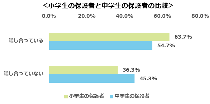 また、小学生の保護者と中学生の保護者で比較をしてみたところ、防災について話し合っていると回答した小学生の保護者は63.7%、中学生の保護者は54.7%と、小学生の子どもがいるご家庭の方が、防災について話し合っているということが分かりました。