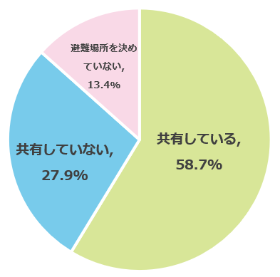 災害時の避難場所について、子どもと共有しているか伺ったところ、共有していると回答した保護者は58.7%。一方で、「共有していない(27.9%)」、「避難場所を決めていない(理解していない)(13.4%)」と、4割以上の保護者が避難場所を共有していなかったり、避難場所を決めていない(理解していない)ということが分かりました。