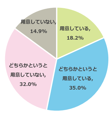災害に備え、備蓄品を常に用意しているか伺ったところ、「用意している(18.2%)」、「どちらかというと用意している(35.0%)」と合わせると53.2%の保護者が災害に備え、備蓄品を用意していることが分かりました。一方で、「用意していない(14.9%)」、「どちらかというと用意していない(32.0%)」と合わせて46.9%、4割以上の保護者が災害に備えた備蓄品を用意していないことが分かりました。
