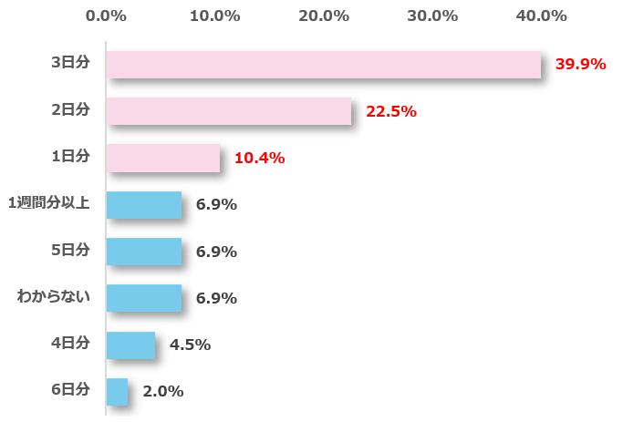 災害に備え、備蓄品を用意していると回答した404名の保護者を対象に、何日分の備蓄品を用意しているのか質問したところ、最も多かったのが「3日分(39.9%)」、次に「2日分(22.5%)」、「1日分(10.4%)」と続きました。