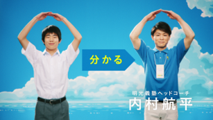 前回のCMに引き続き、明光義塾ヘッドコーチ・体操選手の「内村航平」さんが登場する今回の新CM。内村さんは明光義塾の生徒と一緒に、90%の保護者が成績アップを実感した「分かる 話す 身につく」授業を「テッパン技」としてキレキレの体操の動きで表現しています。