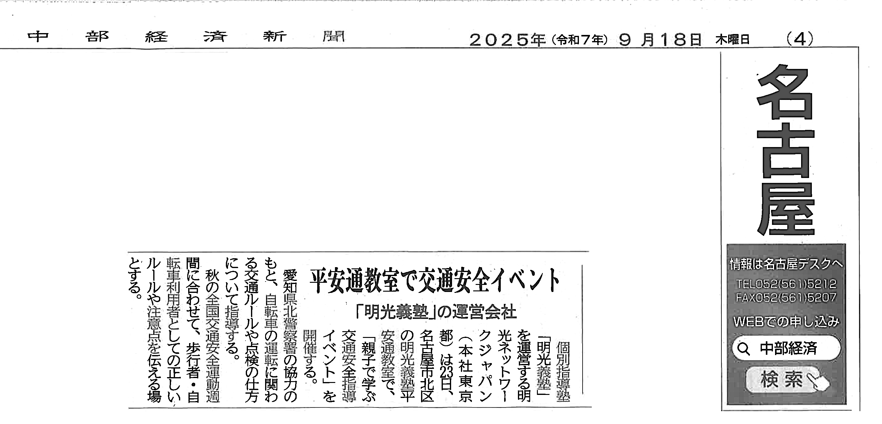 9月23日に明光義塾 平安通教室にて開催する『親子で学ぶ交通安全指導イベント』について、9月18日の中部経済新聞 4面にてお取上げいただきました