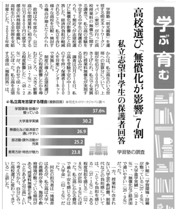 当社が10月に実施した「私立高校無償化に関する意識調査」が、12月17日付の読売新聞朝刊(10面)に掲載されました。 受験生をかかえる保護者1,000名の実情を明らかにした調査として注目されました。 2025年12月17日掲載 東京読売新聞「学ぶ育む:高校選び『無償化が影響』7割」