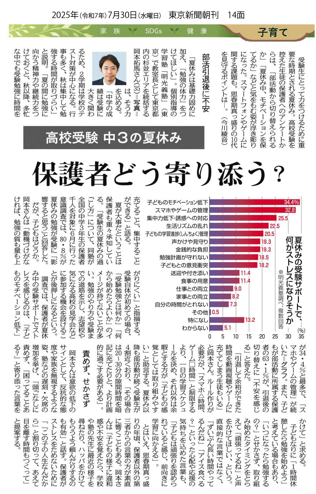 このたび、2025年7月30日付の東京新聞朝刊 14面に当社の個別指導の学習塾「明光義塾」で教室長として東京都内の杉並エリアを統括する岡本拓馬プレイングマネージャーのインタビュー記事が掲載されました。