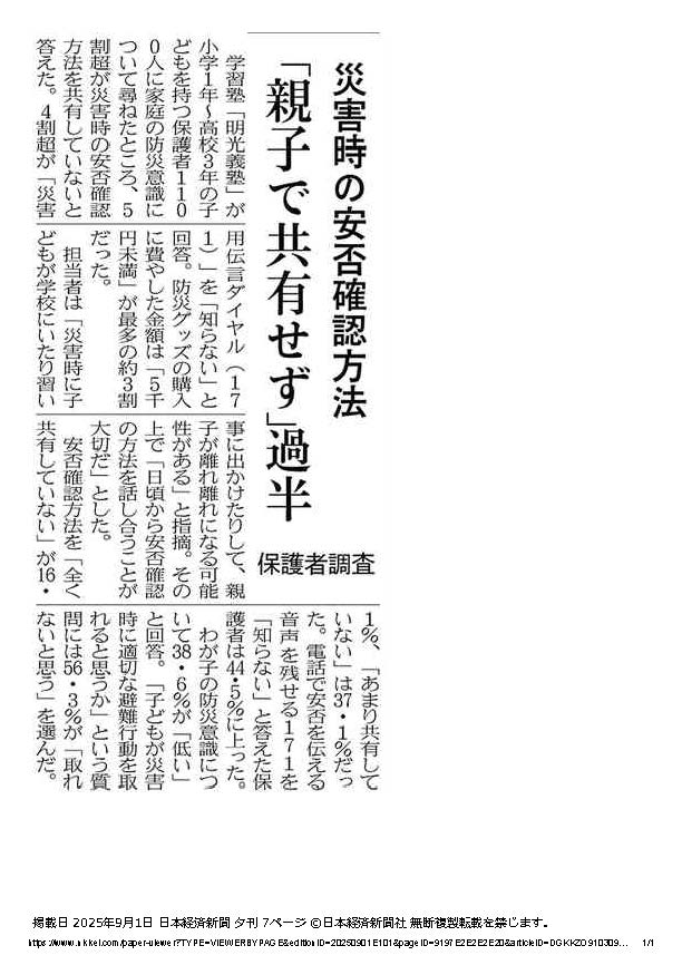 災害時の安否確認方法 「親子で共有せず」過半 日本経済新聞9月1日(共同通信配信)にて当社の調査リリース 明光義塾調べ 「子どもがいる家庭の防災に関する実態調査」 (2025年8月8日)についてお取りあげいただきました。
