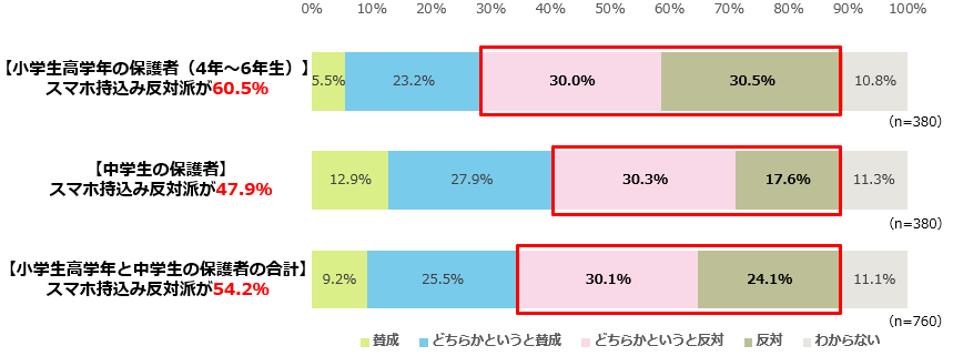 そこで、学校へのスマホの持込みに関して、小中学生の保護者の方がどのように思っているか聞いたところ、小学生高学年(4年~6年生)の保護者では「賛成(5.5%)」、「どちらかというと賛成(23.2%)」と合わせて28.7%の保護者が賛成。「反対(30.5%)」、「どちらかというと反対(30.0%)」と合わせて60.5%が反対という結果になりました。