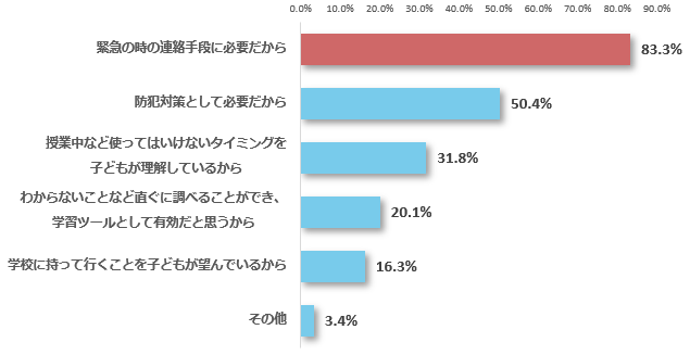 - 小中学校へのスマホの持込み賛成理由第1位は「緊急の時の連絡手段に必要だから(83.3%)」