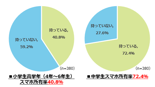 子どもがスマホを所持しているか聞いたところ、小学生高学年では「持っている(40.8%)」、中学生では「持っている(72.4%)」という結果になりました。