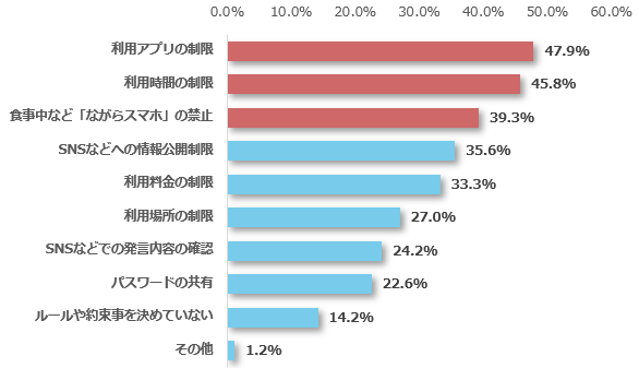 子どもがスマホを所有していると回答した430名を対象に、ご家庭内でスマホに関してどのようなルールや約束事があるかを聞いたところ、最も多かったのが「利用アプリの制限(47.9%)」、次に「利用時間の制限(45.8%)」、「(食事中など)ながらスマホの禁止(39.3%)」と続きました。