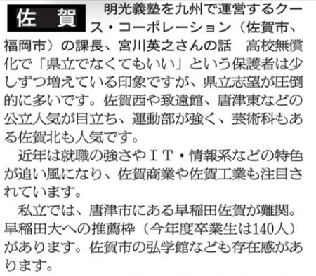 高校受験シーズンにおける進路選択の動向について取材を受け、紙面にて紹介されました。 来春からの高校授業料無償化拡大を背景に、公立・私立高校の選択をめぐる変化について、佐賀県の受験事情を踏まえたコメントを掲載いただいています。