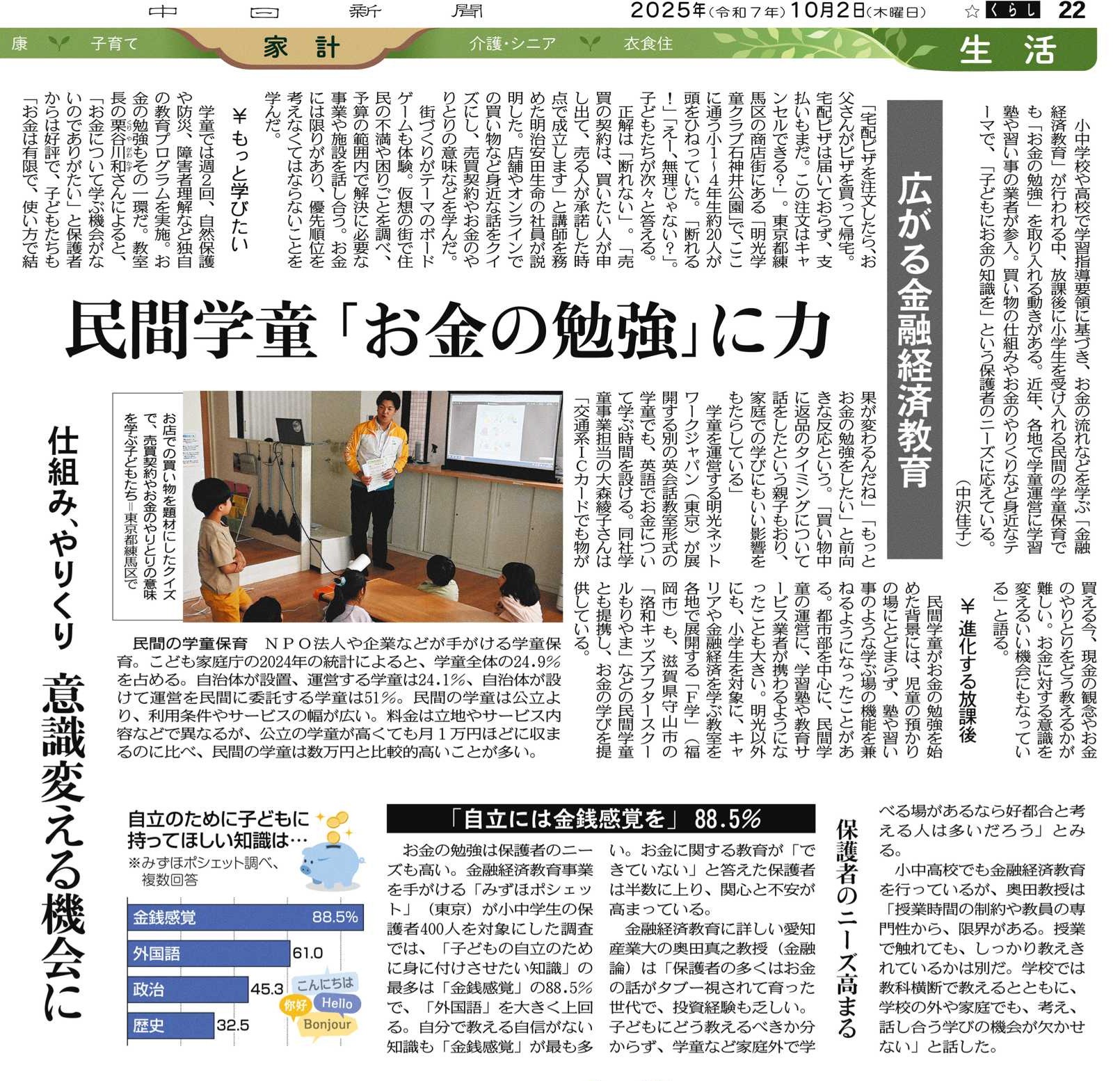 中日新聞 10月2日朝刊(22面)にて、当社キッズ事業部が運営する「明光学童クラブ石神井公園」で開催された、明治安田生命保険相互会社との連携による『遊びながら学ぶ金融・保険、SDGs授業』についてご紹介いただきました。