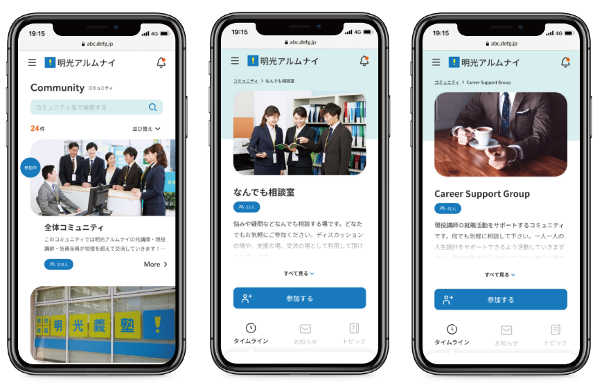 当社の人材支援事業である「明光キャリアエージェント」から、卒業講師に対しては「キャリアに対する考えを深める場の提供」、現役講師に対しては「就職活動に対する支援」を行います。また、同じ志を持って働いた仲間だから聞けること、言えることがあり、本SNSを通じて、交流することでビジネス上のメリットにもなります。