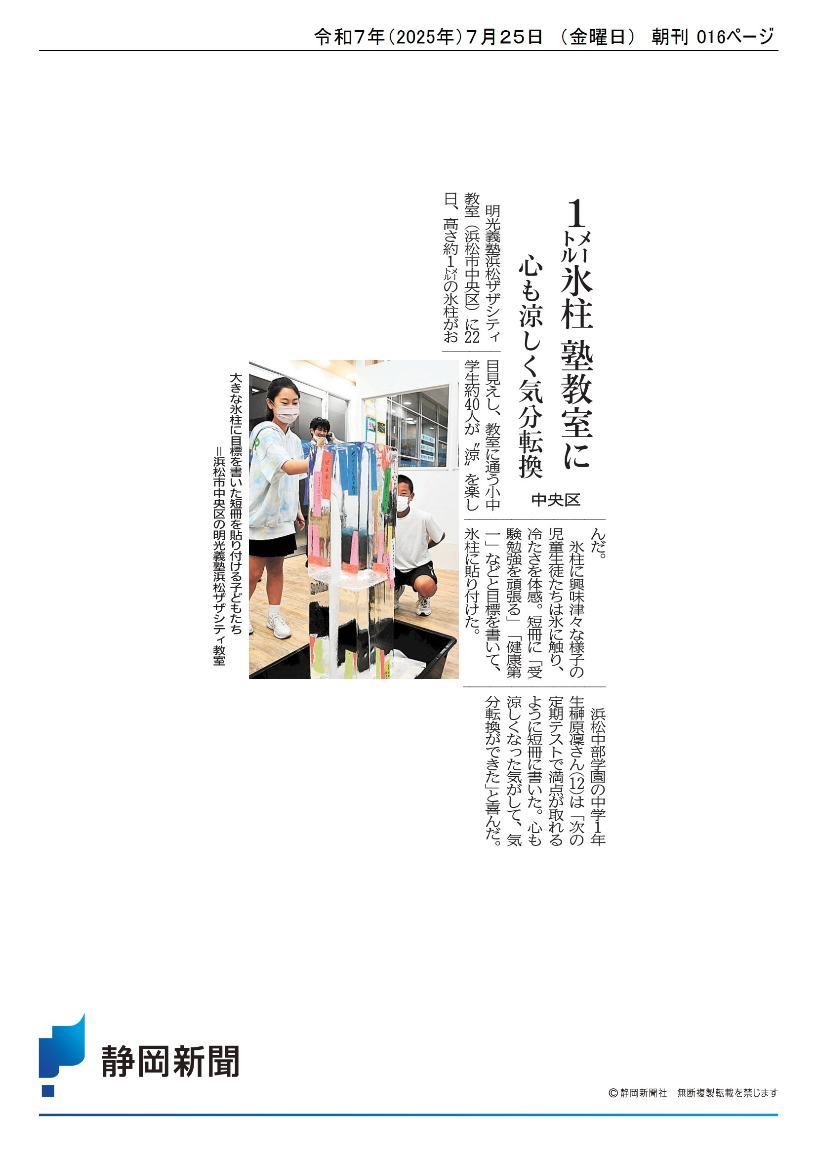 教室内に高さ約1メートルの氷柱を設置すると、生徒たちはその大きさに驚きながらも興味津々の様子で、順番に氷柱へ近づき、手で触れて冷たさを楽しみながら夏の訪れを肌で感じていました。 また、「勉強をがんばる」「健康に過ごしたい」「毎日幸せを見つけたい」「次の定期テストで100点を取りたい」など、この夏休み期間の目標や願いを短冊に記しました。 それぞれが自分の思いを言葉にすることで、目標に向かって一歩を踏み出す、夏の良いスタートとなるイベントとなりました。