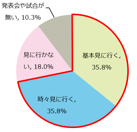 子どもの部活動の発表会や試合を見に行くかを聞いたところ、「基本見に行く(35.8%)」、「時々見に行く(35.8%)」と、あわせて7割以上の保護者の方が、子どもの部活動での活躍を応援しに行っていることがわかりました。また一方で、約2割の保護者の方は「見に行かない(18.0%)」と回答しました。