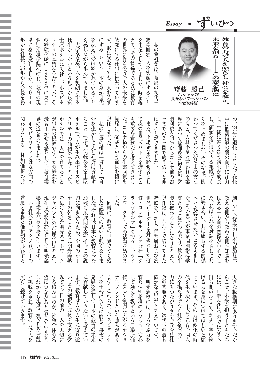 2026年3月11日掲載「財界」117ページ ずいひつ 教育の力で人を照らし、社会を変え、未来を創るーこの志を胸に