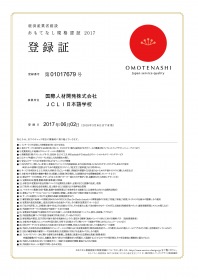 当社の連結子会社である国際人材開発株式会社(代表取締役社長 荻田 修)は、平成29年6月2日付けにて経済産業省が創設した「おもてなし規格認証」制度における『紅認証』登録をしましたので、お知らせいたします。