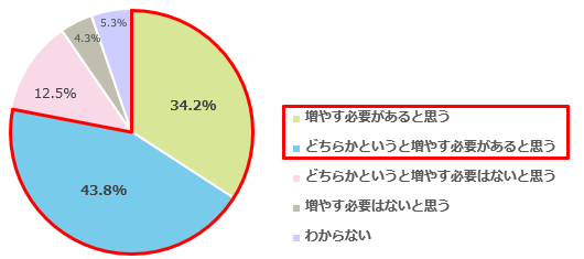小学3年生から中学3年生までのお子さまを持つ保護者男女800名を対象に、「教育改革」に伴う学校の授業の変化に関して、お子さまの勉強時間を増やす必要があると思うか聞いたところ「増やす必要があると思う(34.2%)」、「どちらかというと増やす必要があると思う(43.8%)」と合わせて78%の保護者が子どもの勉強時間を増やす必要があると感じていることが分かりました。