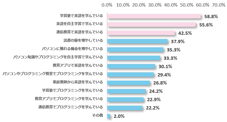 また、教育改革に向けて準備をしていると回答した保護者153名を対象に、自身の子どもはどのような準備をしているか聞いたところ、最も多かったのが「学習塾で英語を学んでいる(58.8%)」、次に「英語を自主学習で学んでいる(55.6%)」、「通信教育で英語を学んでいる(42.5%)」と続きました。
