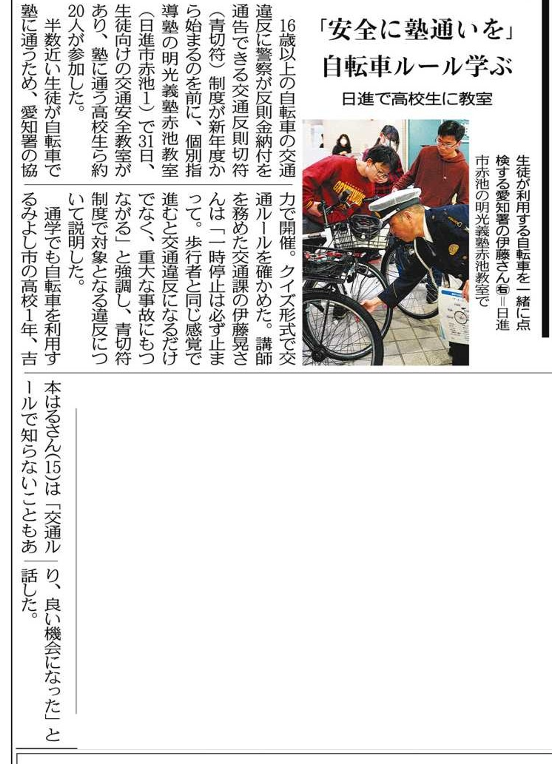 「安全に塾通いを」自転車ルール学ぶ 日進で高校生に教室