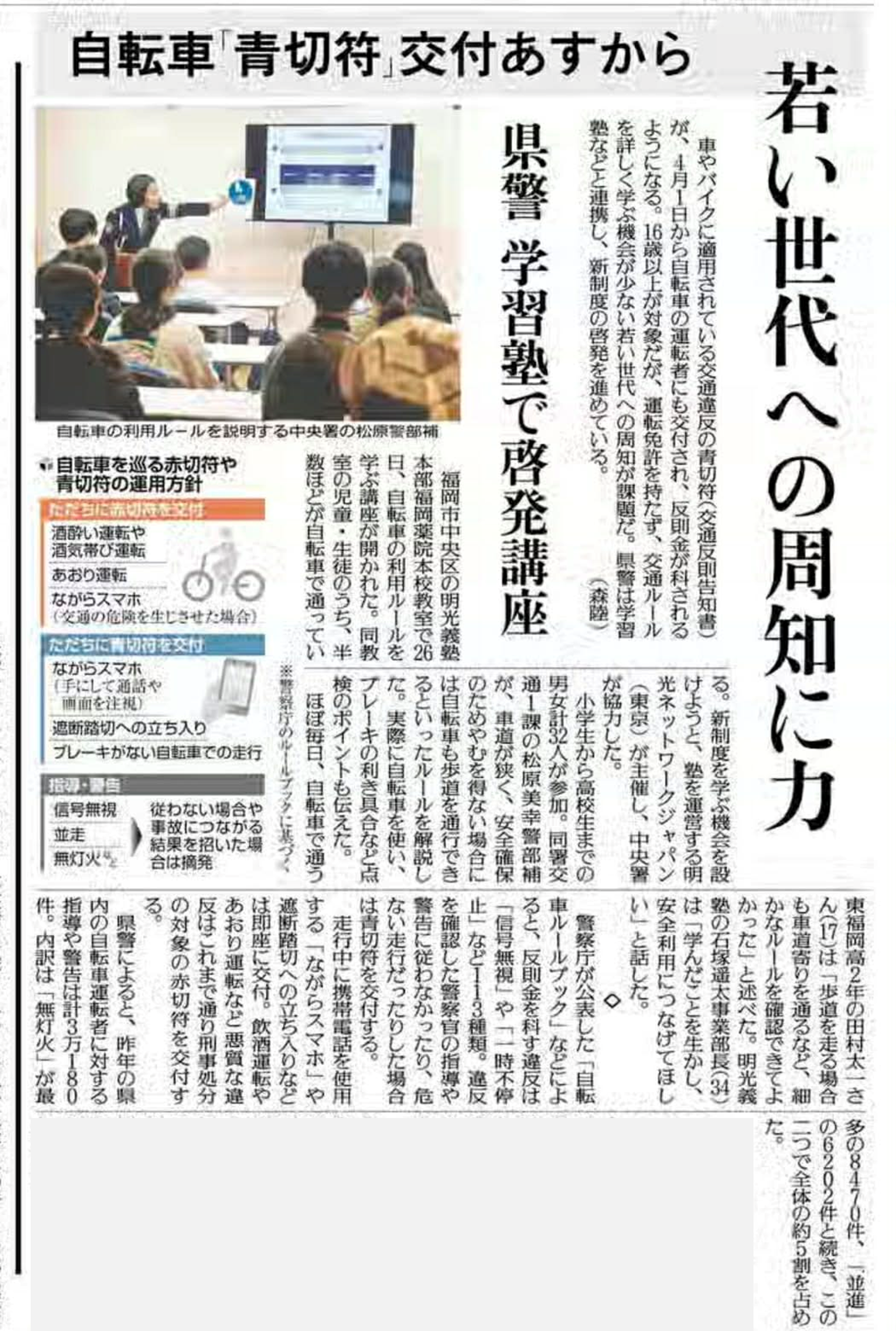 自転車「青切符」交付あすから 若い世代への周知に力 県警 学習塾で啓発講座=福岡