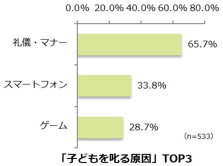子どもを叱る原因TOP3は、「礼儀・マナー」 「スマートフォン」 「ゲーム」