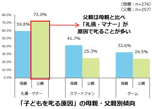 - 叱る頻度は母親が高く、父親の叱る原因には「礼儀・マナー」が多い