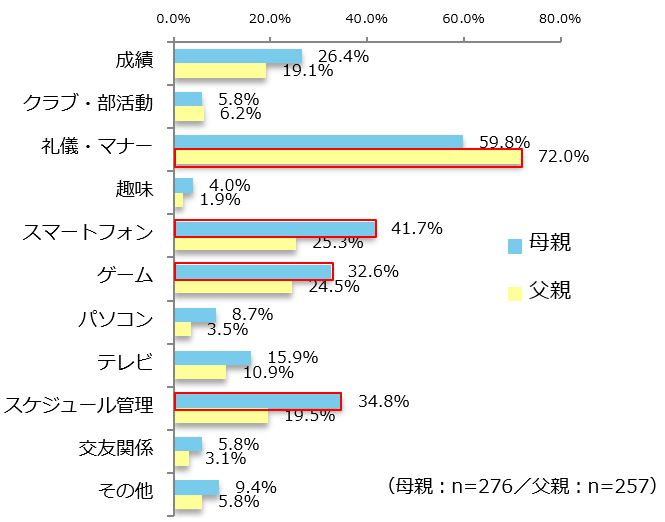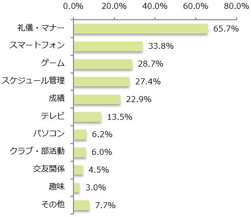 またその他回答として「生活態度」や「整理整頓や片付け」、「就寝時間・寝坊」といった回答も見られました。