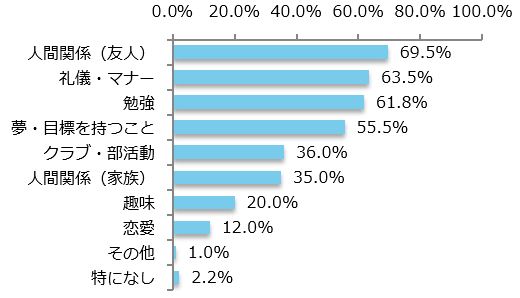 子どもが将来後悔しないために大切にしてもらいたいことを聞いたところ、最も多かったのは「人間関係(友人)(69.5%)」で、次いで「礼儀・マナー(63.5%)」、「勉強(61.8%)」、「夢・目標を持つこと(55.5%)」、「クラブ・部活動(36.0%)」、「人間関係(家族)(35.0%)」、「趣味(20.0%)」、「恋愛(12.0%)」と続きました。