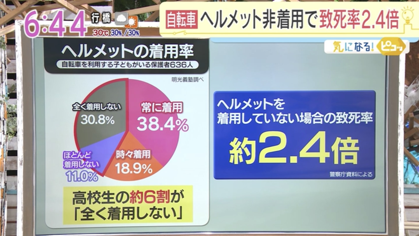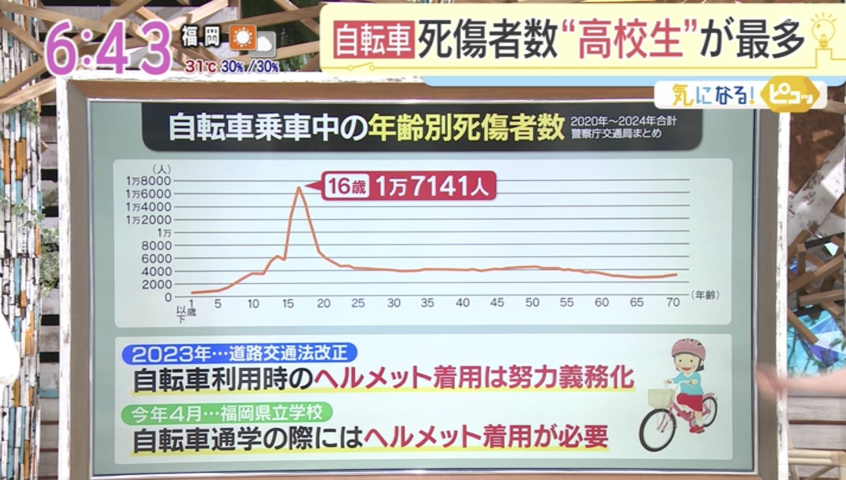 番組では、これらのデータをもとに、ヘルメットを着用していない場合は致死率が約2.4倍にのぼることや、補助金制度の紹介など、日常生活に直結する啓発が行われました。調査結果が地域社会での気づきにつながり、保護者や生徒の皆さんに「自分の命を守る行動」の大切さを考えていただく契機となったことを、私たちは大変うれしく思います。