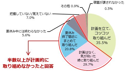 ■夏休みの宿題に「計画を立て、コツコツ取り組めた」は35.5%に留まった