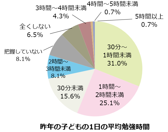 夏休みの宿題の取り組み方に続き、昨年お子さまが1日平均どれくらい勉強したかを聞いたところ、最も多かった答えが「30分~1時間未満」で31.0%、次いで「1時間~2時間未満」が25.1%、「30分未満」が15.6%と続きました。