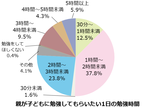 次に今年の夏、親は子どもにどれくらい勉強してほしいのかを聞いたところ、最も多かった答えは「1時間~2時間未満」で37.8%、次いで「2時間~3時間未満」が23.8%、 「30分~1時間未満」が12.5%と続きました。