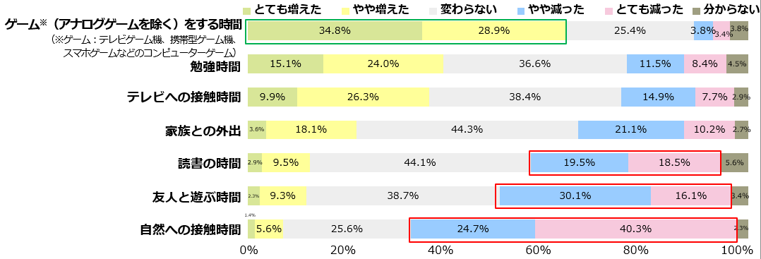 ゲームの時間が増えた一方、自然への接触や読書、友人と遊ぶ時間が減少