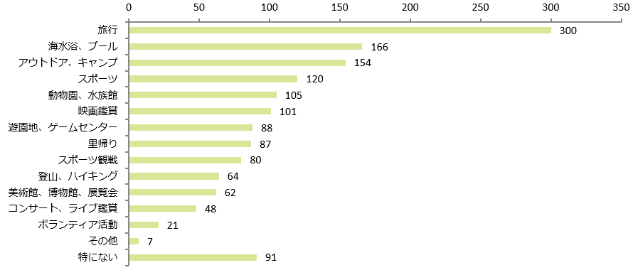 今年の夏休みにお子さまと一緒にやってみたいことの第1位は「旅行」、続いて「海水浴・プール」「アウトドア・キャンプ」と続きました。これまでの設問から、勉強時間や宿題を気にかける一方、長期休暇を利用して、ふだんはできない体験をお子さまと一緒にしたいという保護者の気持ちが読み取れます。