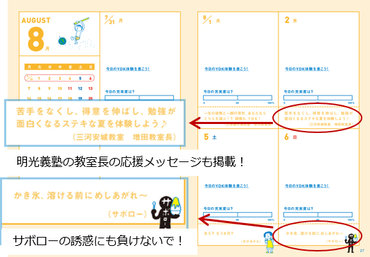 夏休みの子どもの生活で保護者から多く寄せられる悩みとして、生活リズムが崩れてしまうことや、勉強と部活の両立などが多くあります。スケジュール帳には日々の“YDK体験”や充実度を記載する欄を設けたほか、全国各地にある明光義塾の教室長から寄せられた応援メッセージも毎日日替わりで掲載しています。