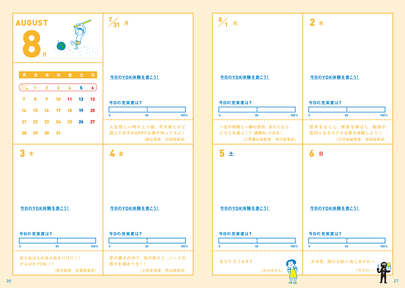 この手帳でお子さまが自分自身で“やれば・できる・子(YDK)“であることに気づいてもらい、この夏の成長をかけがえのない記録として残していただければ幸いです。