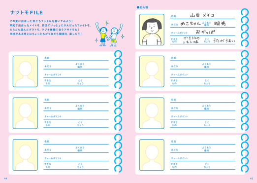 また、家族や友人との時間も充実させてほしいという思いから、友達ファイルや夏の思い出を記載するページもご用意しています。さらに、自由研究や読書感想文に取り組むためのヒントなども盛り込んだ充実した手帳です。