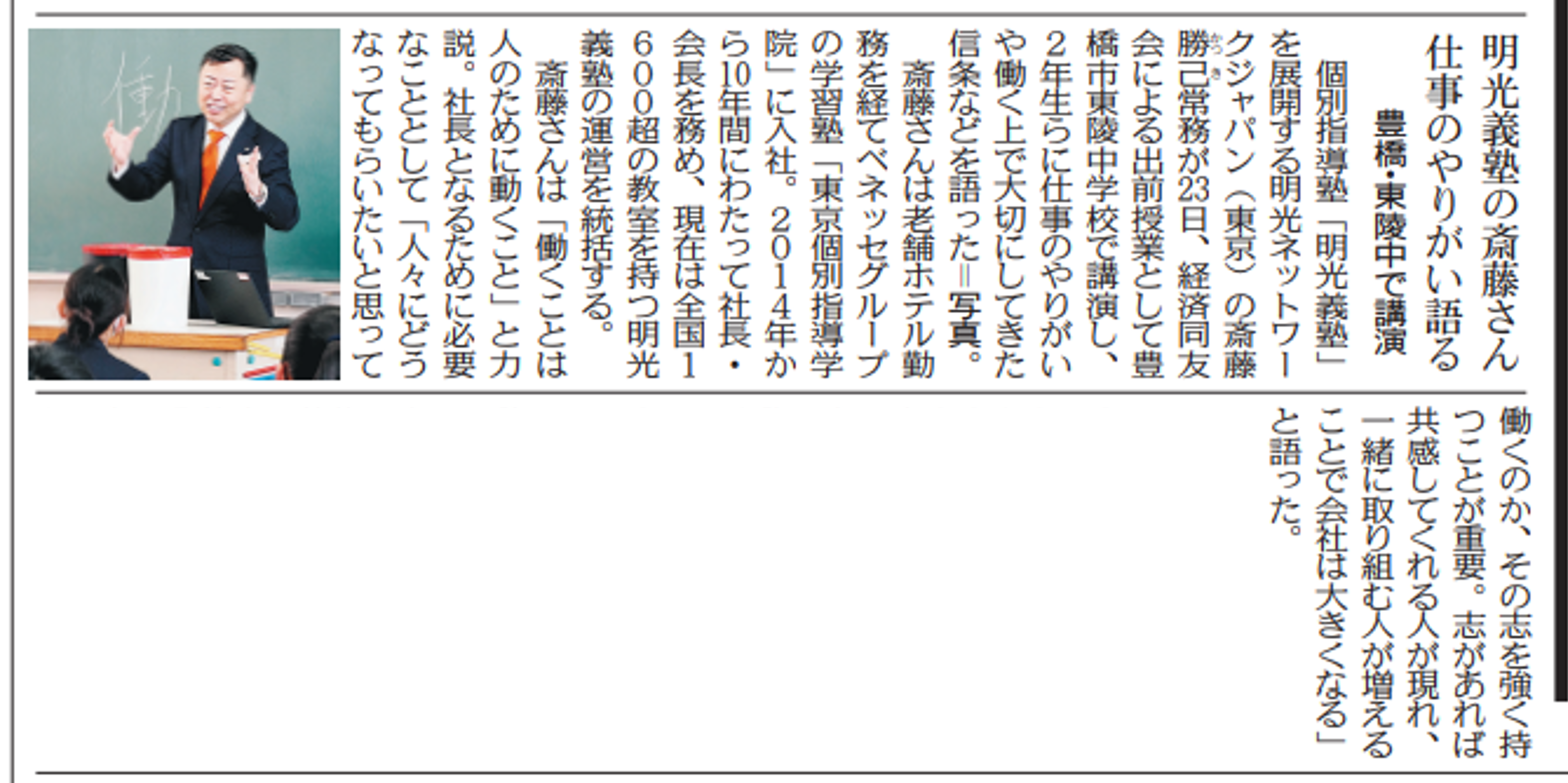 明光義塾の斎藤さん 仕事のやりがい語る 豊橋・東陵中で講演