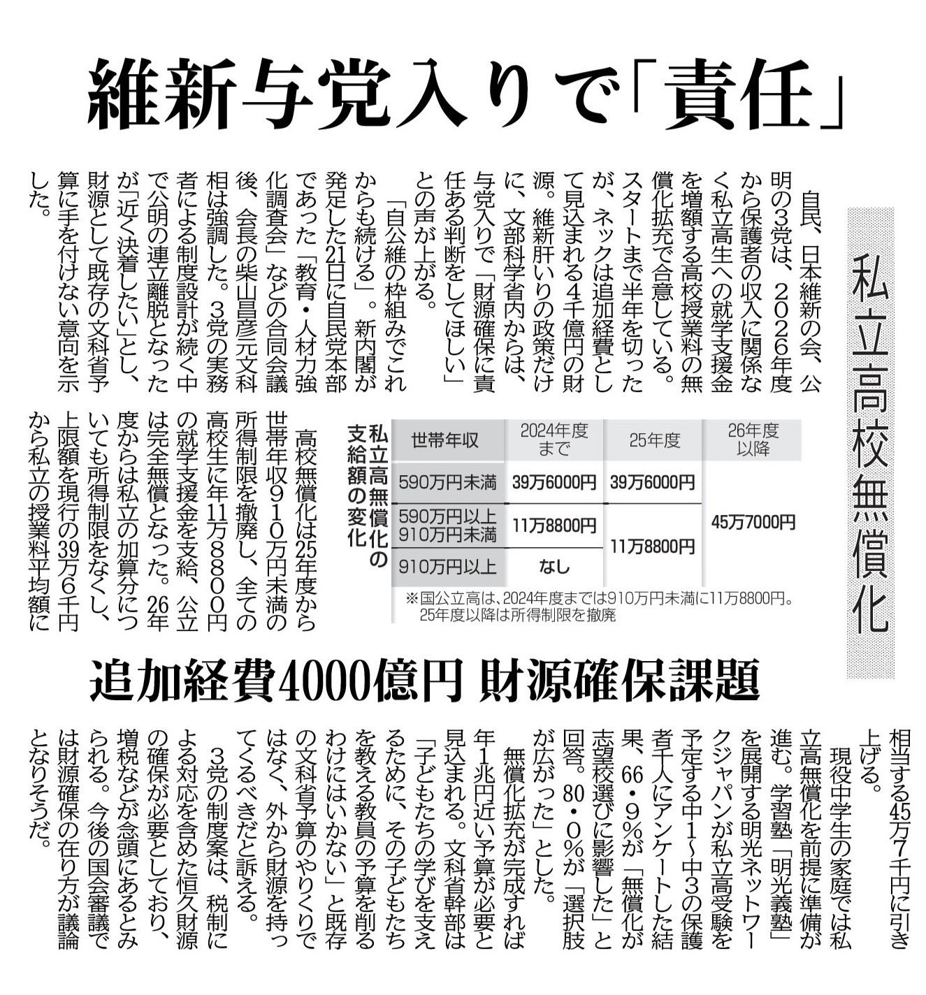 当社が実施した「私立高校授業料無償化に関する意識調査」が、共同通信社の記事として配信され、全国各地の新聞に掲載されました。 本調査では、私立高校の授業料支援制度拡充に対する保護者の意識や、進路選択への影響があきらかになりました。今後も教育現場やご家庭の声をもとに、子どもたちの学びの機会拡大につながる情報発信を続けてまいります。 お問い合わせ 明光義塾本部 渉外・広報 石田 pr@meikonetwork.jp