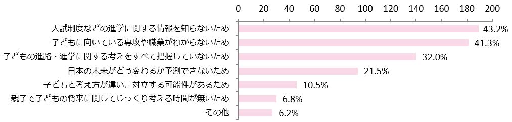 次に、 「有益なアドバイスはできないと思う」、「どちらかというと有益なアドバイスはできないと思う」「どちらともいえない」と回答した方を対象にその理由を聞いたところ、最も多かった回答は「入試制度など進学に関する情報を知らないため」(43.2%)でした。多様化する大学入試制度に関して戸惑っていることがうかがえます。