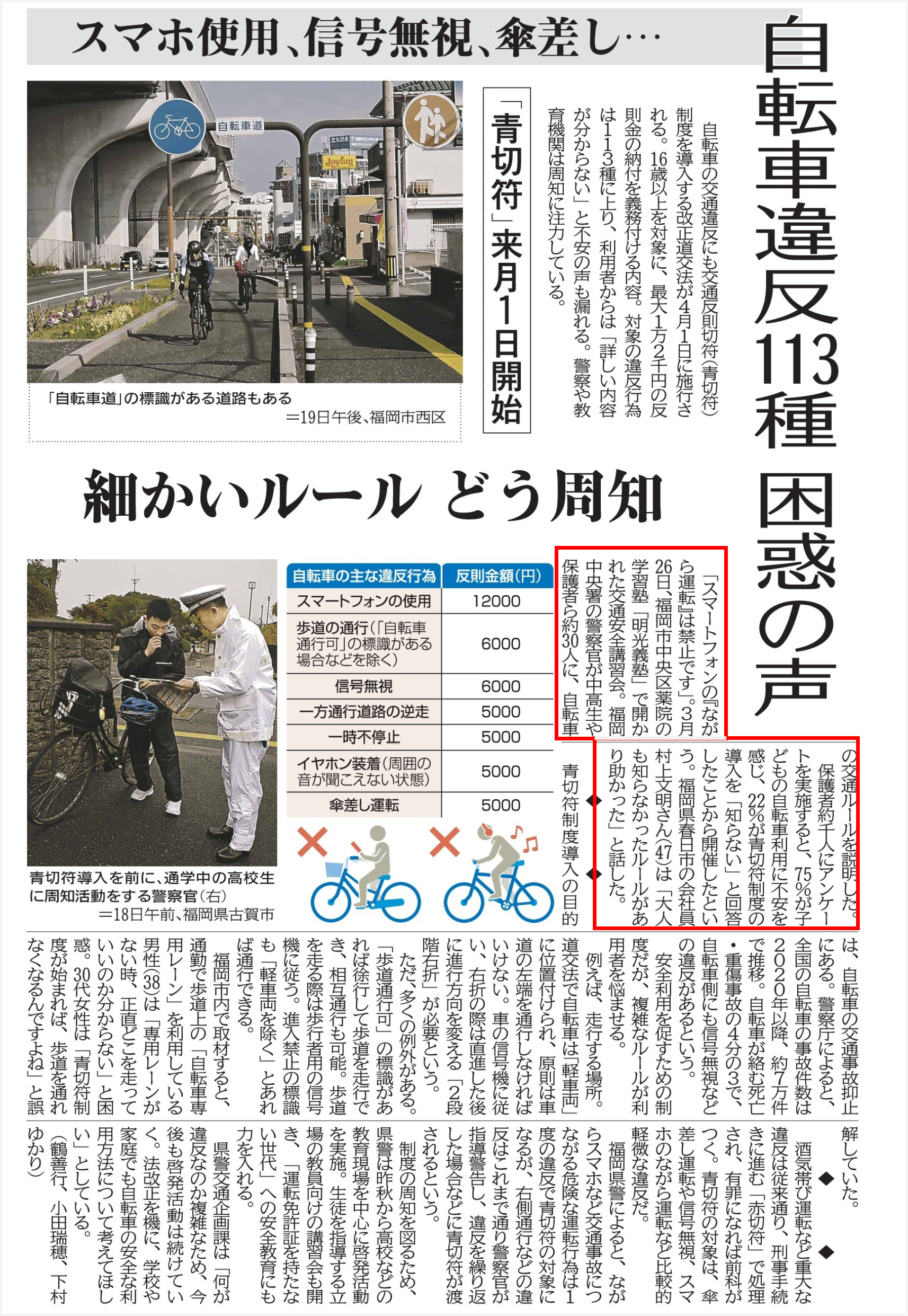 スマホ使用、信号無視、傘差し・・自転車違反113種 困惑の声「青切符」4月1日開始 細かいルール どう周知