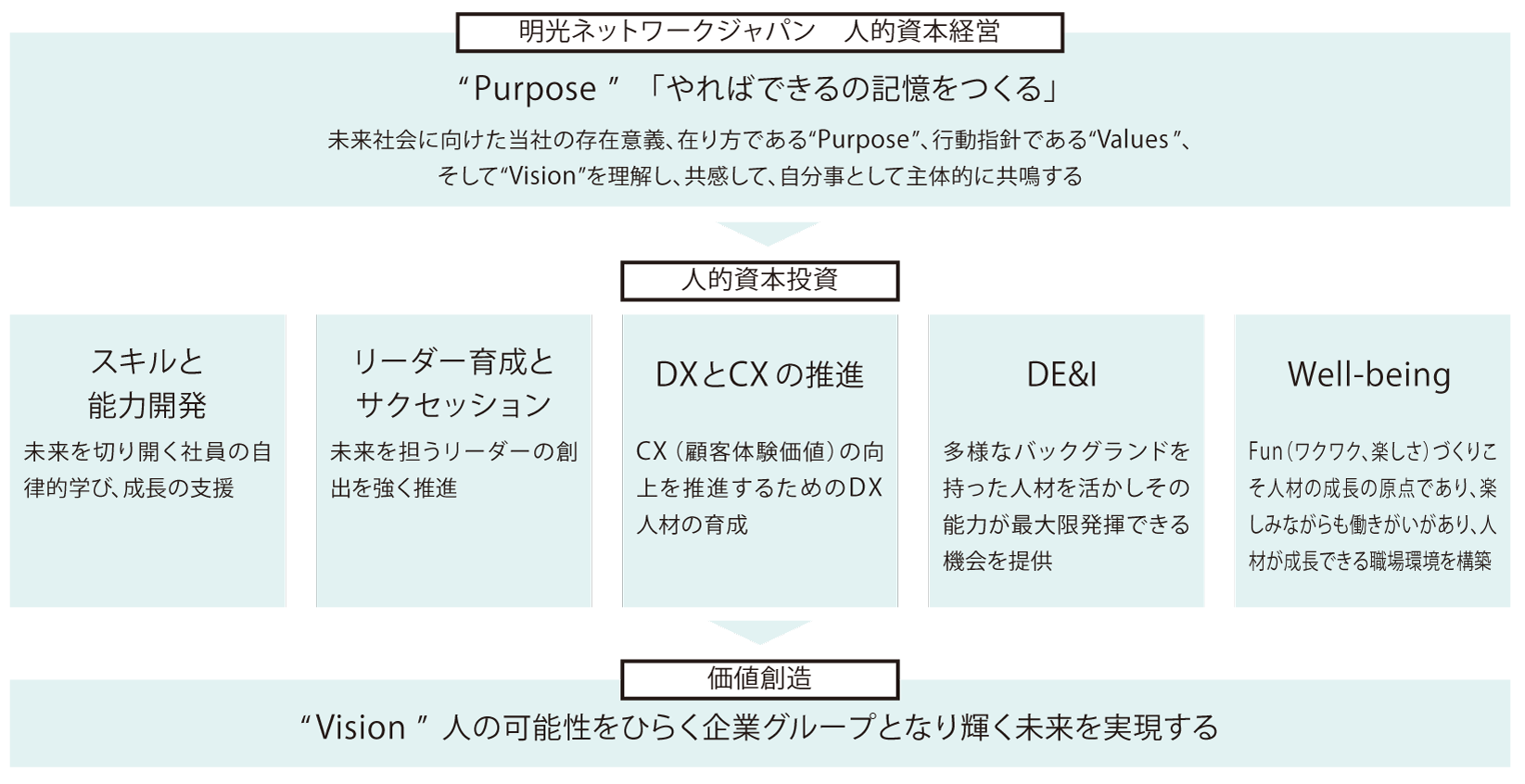 明光ネットワークジャパンは、「子どもたちの自立を支援する」教育事業会社から、幼児からシニアまで「あらゆる人々の可能性をひらく」グループへ、“Purpose”「『やればできる』の記憶をつくる」を起点に、一人ひとりのライフステージに応じた「輝く未来」を実現する、総合的な人材支援グループを目指しております。