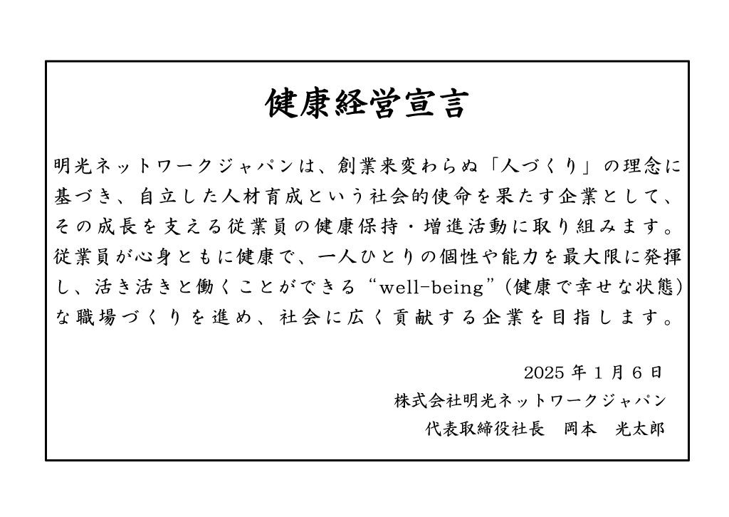 従業員一人ひとりの心身の健康維持・増進により、個性や能力を最大限に発揮して、イキイキと働くことができる職場づくりを実現させ、持続的な会社の成長と社会への貢献を果たしてまいります。