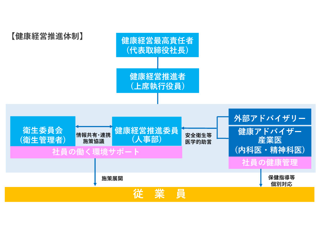 代表取締役社長を最高責任者として任命し、ダイバーシティ推進室・産業医・衛生委員会が一体となって、当社従業員の健康を維持・増進する取り組みを推進しています。