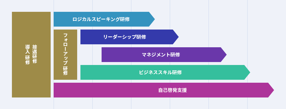 新⼊社員のフォローアップから管理職のビジネススキルアップまで、キャリアに応じたさまざまな研修制度を整備。⾃ら課題を発⾒し、解決していく⾃⽴型⼈材とともに、新成⻑戦略を⽀えるマネジメント⼈材を育成しています。
