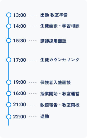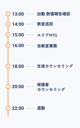 教室長の育成や運営サポート、業績改善を行いながら、教育現場全体の質を高めていく役割です。人と組織、両方をマネジメントすることで、自身も次のステップへ成長できます。