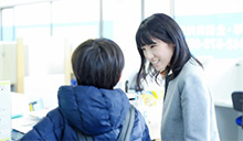 そろそろ塾の開始時間なので玄関で生徒を笑顔でお出迎え。まだ入会直後で慣れない子にも積極的に声を掛け、学習がスムーズに進むようリラックスしたムードを作り上げる。 |